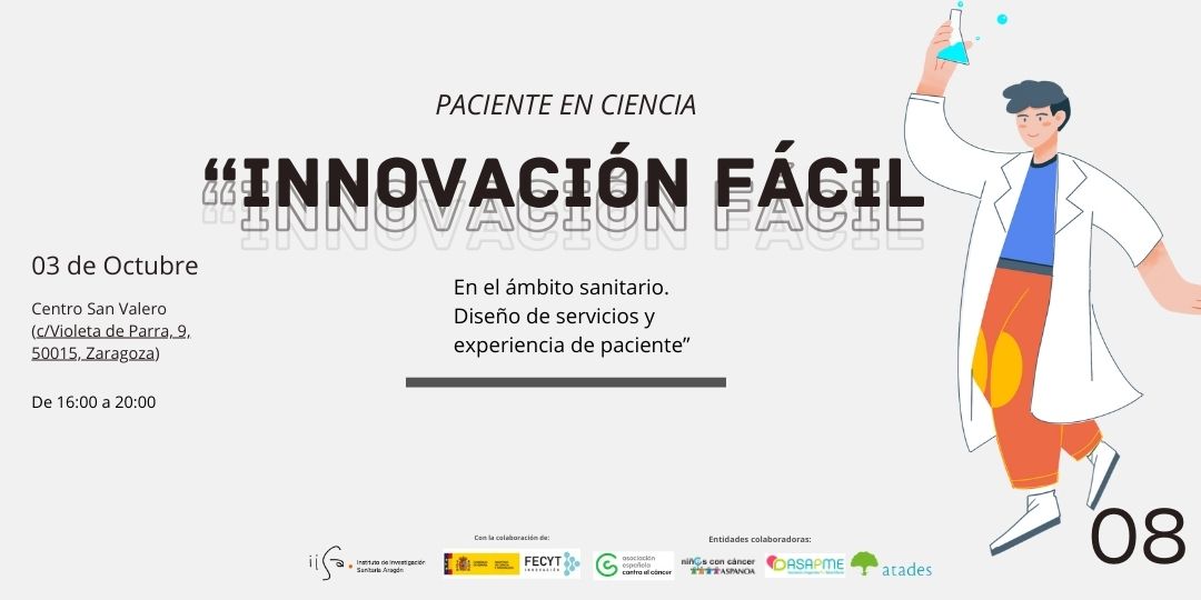 ¿Quieres participar en proyectos de innovación e investigación médica? Este taller, en el que colabora Centro San Valero, es parte del proyecto del IIS Aragón «Paciente en Ciencia» que cuenta con la colaboración de FECYT- Ministerio de Ciencia e Innovación y con la colaboración de las Asociaciones de Pacientes AECC, ASAPME ASPANOA y ATADES y la implicación del Foro Aragonés de Pacientes.